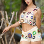 Our “Tropical Mosaic Crochet Shorts” are designed for vibrant summer days, with a high-waisted fit and a colorful crochet pattern. They offer a playful statement on their own or a harmonious look when paired with the matching crop top.